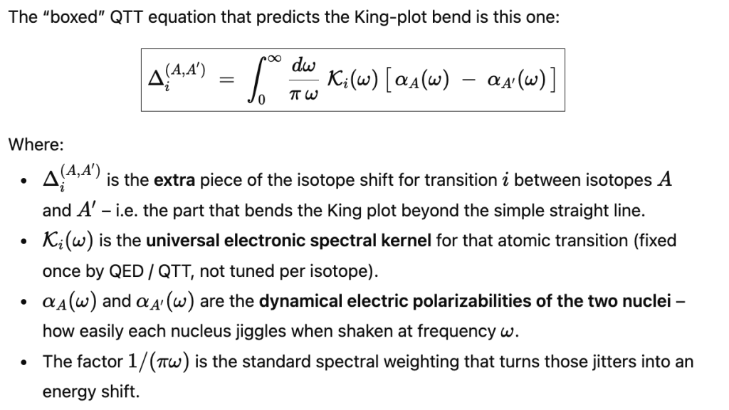 In short: the nonlinear Ca/Ca14+ King plot ( PRL 134, 233002 (2025) ) is a QTT-native effect. It is not a surprise or a tension; it is precisely the kind of nuclear-polarization-driven curvature that falls out of QTT’s low-energy electromagnetic structure.