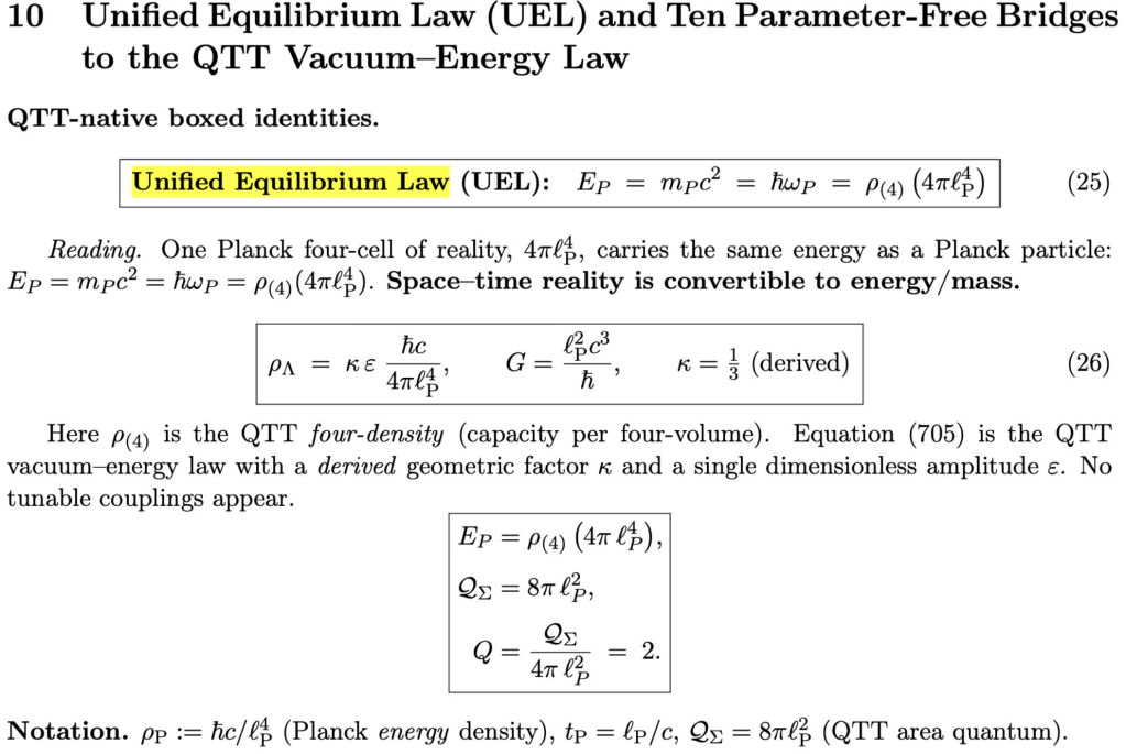 All three are linked by the single microscopic length \(\tilde\ell\), so \(E = mc^2\) and later more complete Unified Equilibrium Law, becomes an internal consistency condition of the QTT microstructure, not an external relativistic constraint.